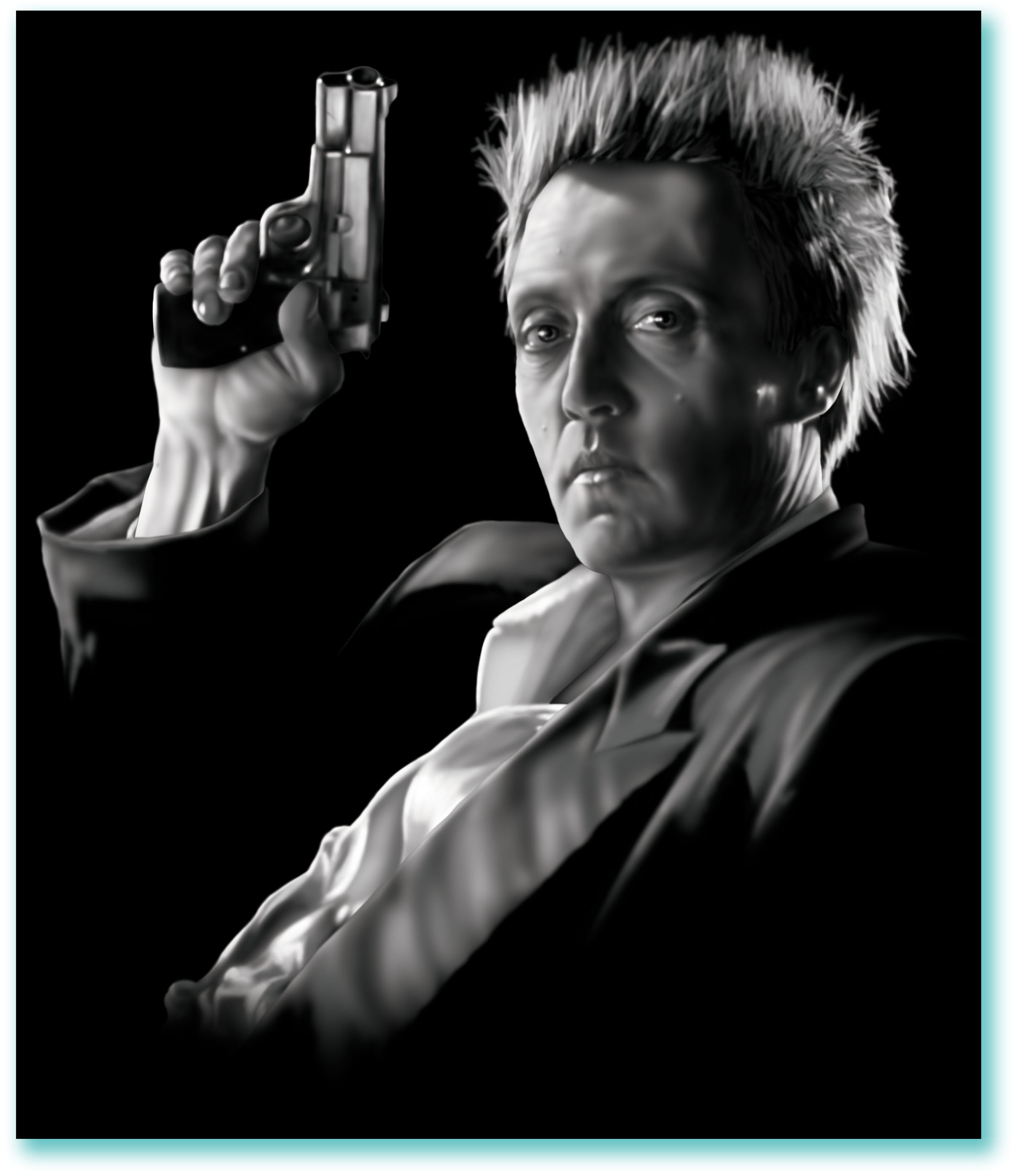 Created as part of an apparel line featuring famous gangsters and tough guys, this portrait of Christopher Walken from the movie King Of New York, prominently featuring his famously protruding eyes, perfectly represents the group.